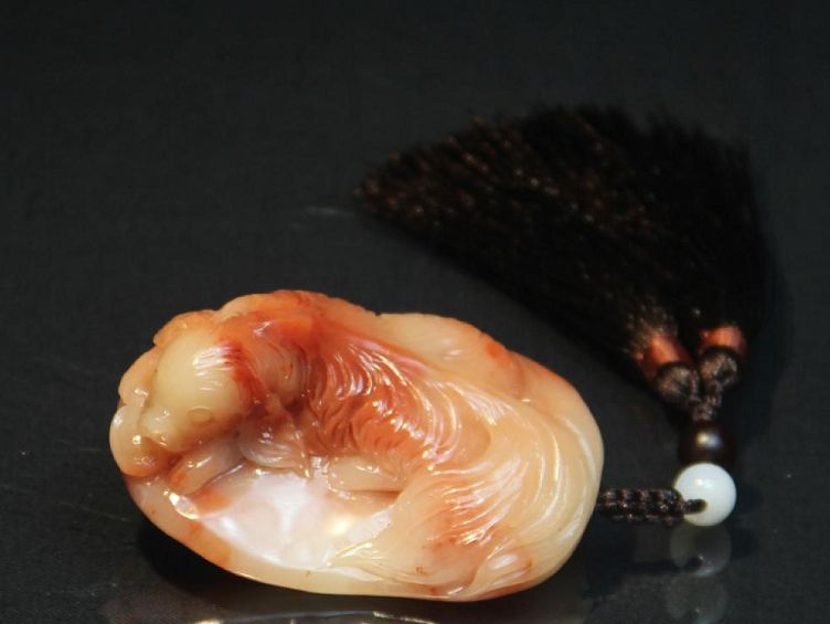 名称:芙蓉石浮雕“旺财”手把件规格:长度:6.6厘米宽度:4.3厘米高度:2.6厘米简介:作品取材寿山石老性芙蓉石,质地温凝,手感顺滑。作品因石而雕,浮雕比熊狗,在狗的嘴巴下还雕刻一个金元宝,寓意“旺财”。在比熊狗的毛发处理上,根据狗的肌骨雕刻蓬松柔软的视觉和触觉感,栩栩如生,形象生动。