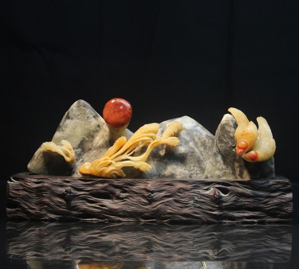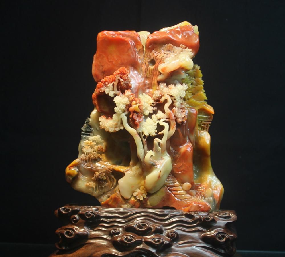 名称:寿山石老坑巧色五彩芙蓉石高浮雕“深山观鹤”摆件 规格:长度:15厘米宽度:4.2厘米高度:20厘米简介:作品取材寿山石老坑五彩芙蓉石,质地温凝细润,色彩艳丽。作品取巧而雕,将红、黄、白色凸显出来,因形就势,将深色部分刻画为山石,飞鹤穿梭其中。以人物为主体,将竹木、藤蔓、楼台凸显出来,刻画风格细腻繁杂,尽显华丽雍容。