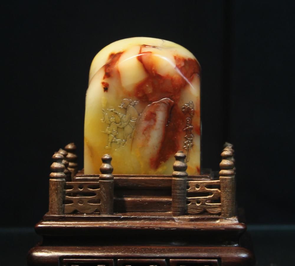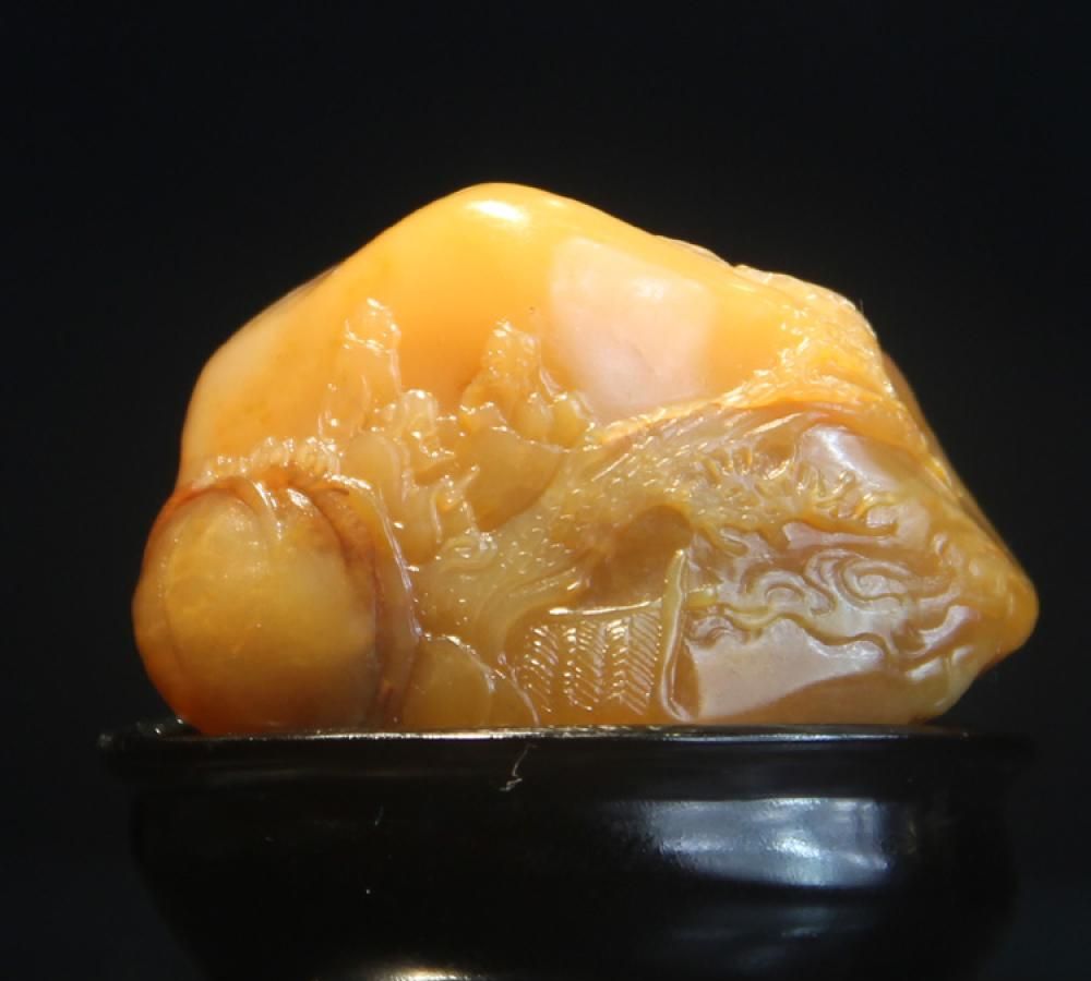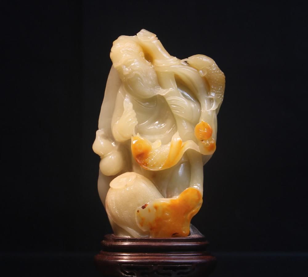 名称:田黄冻石薄意雕“雅聚”摆件尺寸:长度:4.3厘米宽度:1.9厘米高度:3厘米介绍:此田黄冻质地晶莹脂润,细腻凝结,质色上佳。作品在底部故意留有一块石皮并未做抛光打磨(作品照片图中有呈现),留有了田黄石在溪田之间浸润过的天然痕迹。作品依形而雕,雕刻三老深山雅聚,布局疏朗,线条流畅飘逸,是件收藏佳品。
