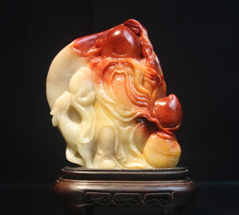 名称:芙蓉石浮雕“鸿运当头老寿星”摆件尺寸:长度:9厘米宽度:1.6厘米高度:10.8厘米介绍:作品取材寿山石老坑芙蓉石,温润如玉,手感细腻。作品取巧而雕,红色部分在于老寿星的头部,寓有“鸿运当头老寿星”之吉祥美意。作品整体造型端庄,比例均称,动态舒展,线条流畅。老寿星慈眉善眼,和蔼可亲,极富感染力。