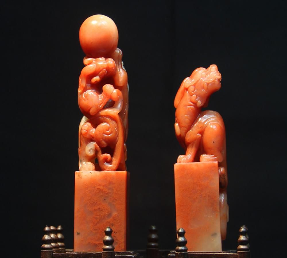 品名:寿山石老坑朱砂芙蓉石圆雕“瑞兽”印章一对尺寸:长度:2.4厘米宽度:2.4厘米高度:11.2厘米简介:作品取材寿山石老坑朱砂芙蓉石,质地细润灵秀,色彩过渡自然,灯光下朱砂闪闪。作品一枚圆雕“双螭戏珠”,螭虎体态蟠曲,充满力度;另一枚雕刻瑞兽,简洁传统,华贵雍容。整体作品雕工精美,线条细腻流畅,充满传统韵味的装饰之美。
