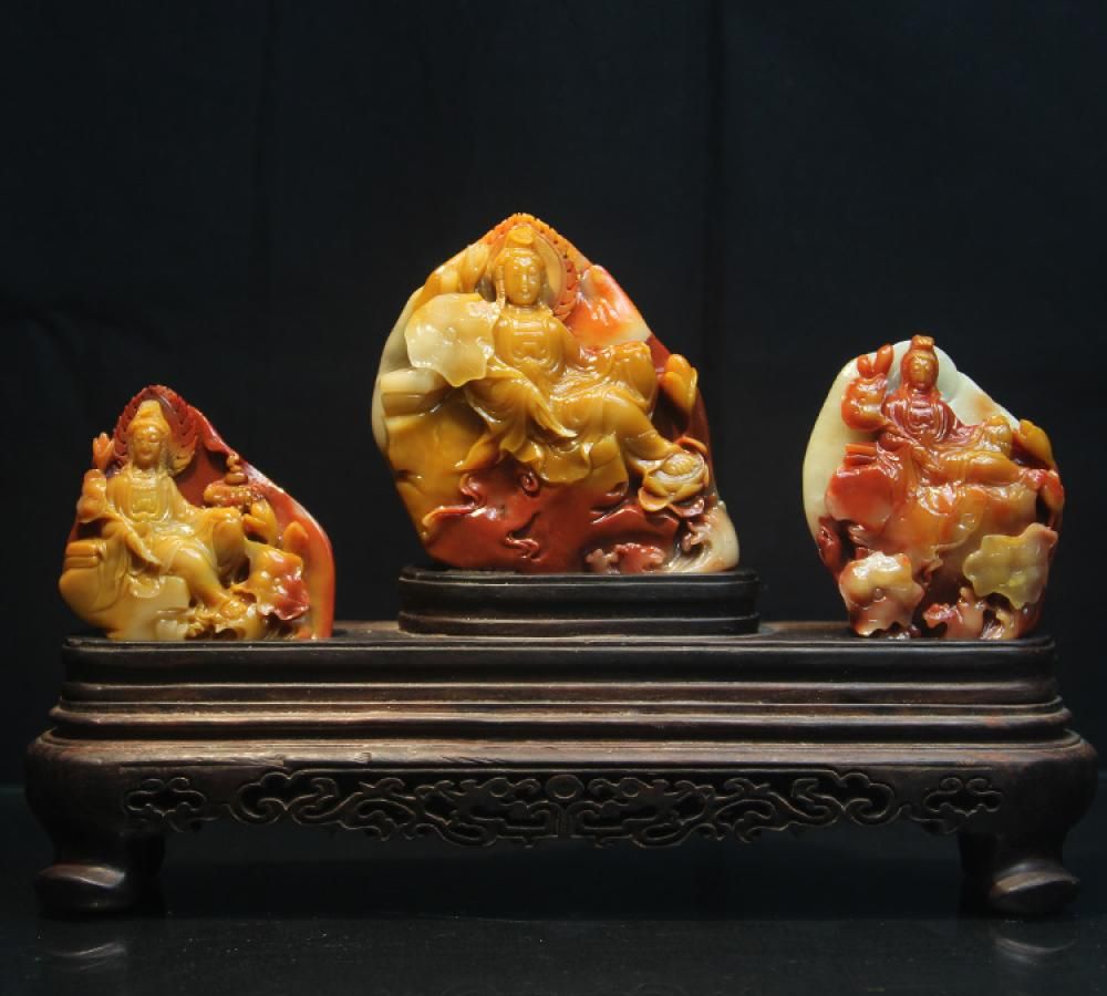 名称:持莲观音摆件规格:长度:26厘米 宽度:7.6厘米 高度:16.5厘米介绍:作品以三块芙蓉石为创作母体,充分利用石材色层分明的特点,或黄色、或红色雕刻观音造像,逐个欣赏又可以单独成体。观音大士手持莲花向后扶靠,双目低垂,眉眼温和,嘴角似微有笑意,面容温婉沉静,身上衣纹飘逸如同流水。作品开丝纤细,使得观音大士的发鬓与衣上流纹细致工整,整件作品线条流畅,姿态
